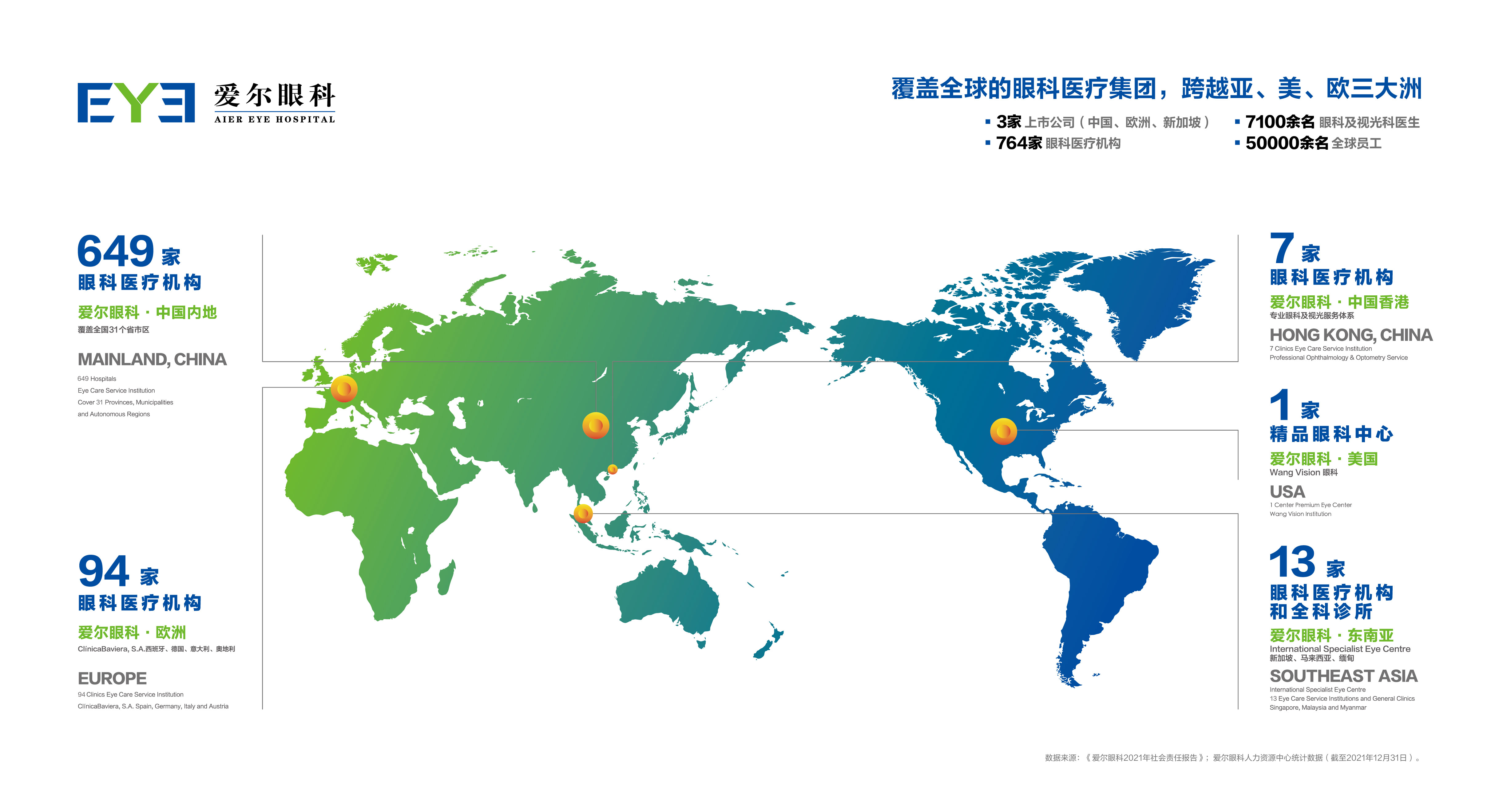 AIER Eye Hospital Group is China’s leading ophthalmology hospital group that covers Asia, Europe, and North America with huge scale and outstanding medical capacity. It has three listed companies in China (stock code: 300015) ,Europe (Spain: CBAV), and Southeast Asia (Singapore: 40T) with a total number of more than 600 specialized eye hospitals and centers and the annual outpatient visits in mainland China exceeded 10 million. Among those eye hospitals and centers, there are more than 500 in Mainland China, 7 in Hong Kong, 1 in the United States, more than 80 in Europe, and 12 in Southeast Asia.